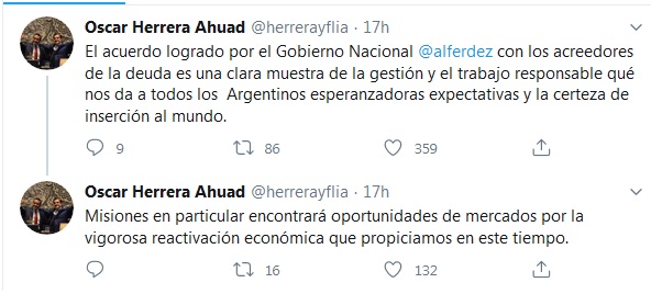 El gobernador Oscar Herrera Ahuad celebró en su cuenta de Twitter el acuerdo por la deuda externa alcanzado por el Gobierno Nacional del presidente Alberto Fernández. “Es una clara muestra de la gestión y el trabajo responsable qué nos da a todos los  Argentinos esperanzadoras expectativas y la certeza de inserción al mundo”.