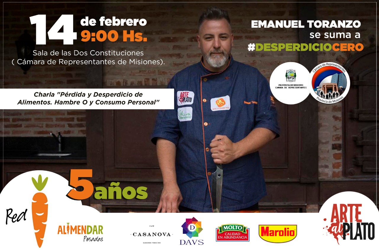 Esta charla, denominada Pérdida y Desperdicio de Alimentos, Desperdicio Cero/Hambre Cero, será llevada a cabo el viernes 14 de Febrero a las 9 en el Salón Dos Constituciones de la Cámara de Representantes de la Provincia de Misiones. Estará a cargo del destacado cocinero de Hurlingham;  Emanuel Toranzo; quien recorre el país con sus recetas autóctonas en el programa que lleva adelante, Arte al Plato.