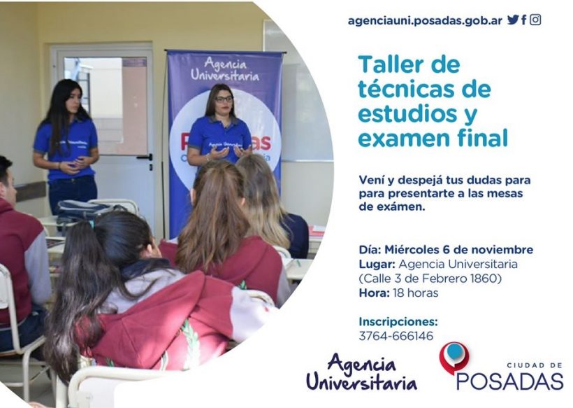 La Agencia Universitaria dijo que el nuevo taller gratuito de técnicas de estudio y examen final comenzará el próximo miércoles 6 de noviembre, a las 18:00, en la oficina del área municipal, ubicada en 3 de Febrero N°1860.