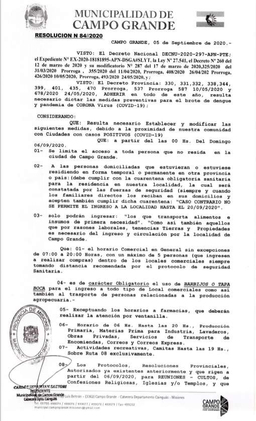El intendente de Campo Grande, Carlos “Kako” Sartori a través de la Resolución N° 84/2020 limita el acceso a toda persona que no resida en la localidad a partir de las 00 de este domingo. Sólo podrán ingresar los transportadores de alimentos o insumos de primera necesidad.