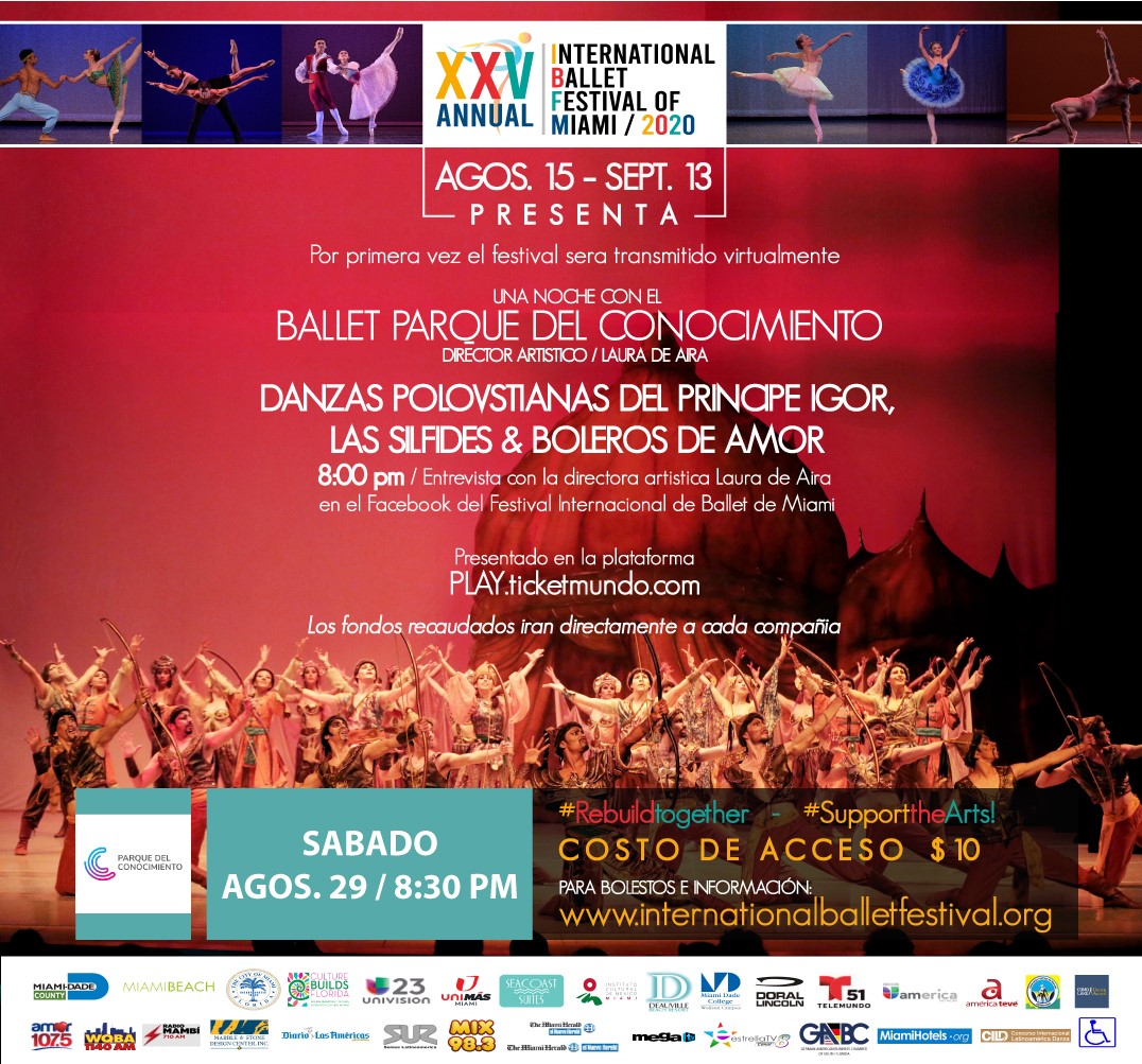 El Ballet del Parque del Conocimiento estará representando a Argentina en esta edición 25 del Festival de ballet y su presentación virtual está programada para el sábado 29 de agosto, a las 20:30, hora de Miami. El programa seleccionado por la directora general del Ballet, Laura de Aira, incluye “Las Sílfides”, con música de Chopin, “Boleros de Amor”, una coreografía original de Adolfo Burgos y “Danzas Polvtsianas”, de la opera Príncipe Igor, acompañada por el Coro Estable y la Orquesta de Cámara del Parque del Conocimiento, bajo la dirección del maestro Emilio Rocholl.
