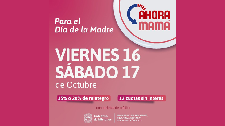“Para el día de la Madre renovamos el Ahora Mamá. Viernes 16 y Sábado 17 de Octubre”, escribió el Gobernador en su Twitter junto a una imagen que especifica que los reintegros serán de hasta el 20% y la posibilidad de pagar en hasta 12 cuotas con tarjeta de crédito.