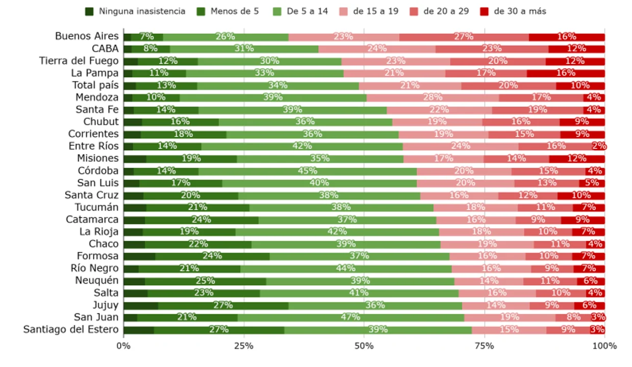 Buenos Aires encabeza el ranking con un 66% de estudiantes que acumulan al menos 15 faltas, seguida por la Ciudad de Buenos Aires (59%), Tierra del Fuego (55%) y La Pampa (54%). En el otro extremo, Santiago del Estero (28%), San Juan (29%) y Jujuy (30%) presentan niveles más bajos de ausentismo, según lo informado por los estudiantes.