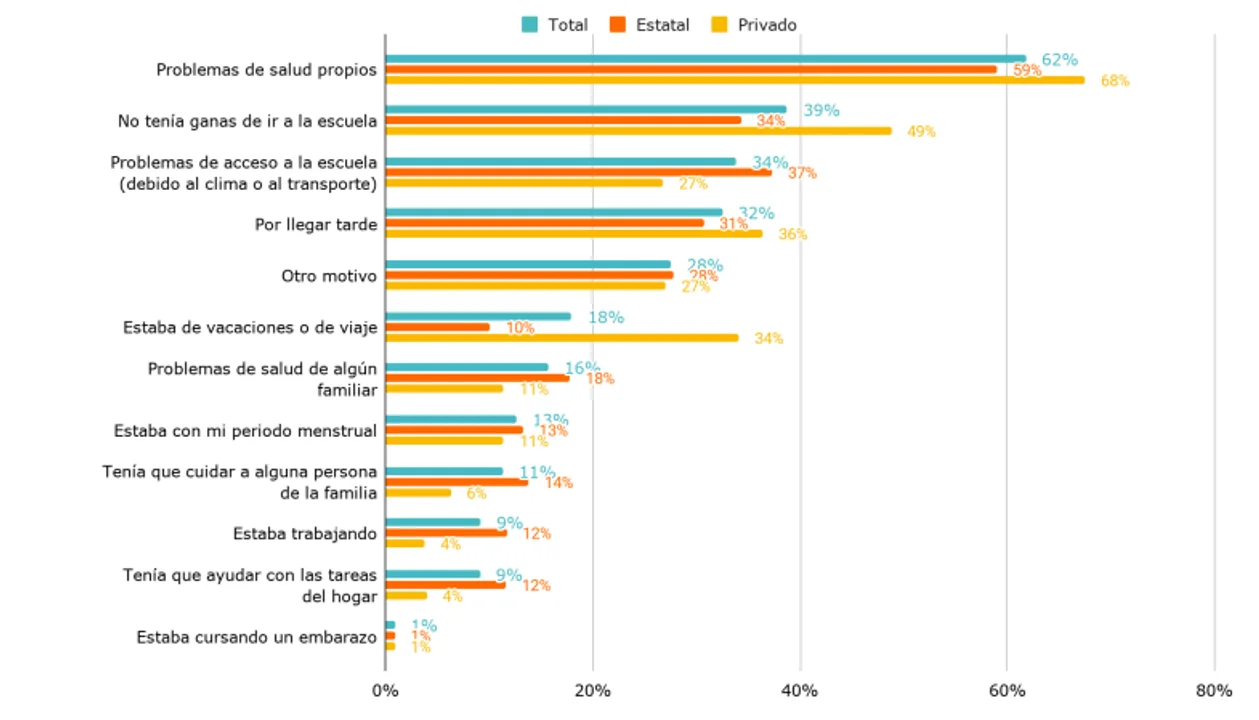 El principal motivo son problemas de salud propios. El 62% de los estudiantes lo consideró como uno de los tres principales motivos de inasistencia. En segundo lugar aparece el motivo “no tenía ganas de ir a la escuela” con el 39%. En este motivo se observa una amplia diferencia entre sectores: fue señalado sólo el 34% de las veces en los estudiantes de escuelas de gestión estatal y el 49% en los estudiantes que asisten a sector de gestión privada. En tercer lugar aparecen “problemas de acceso a la escuela”. En cuarto lugar aparece, con el 32%, el motivo de “llegar tarde a clase”. En quinto lugar, aparecen “otros motivos” y en sexto lugar, estar de viaje o vacaciones donde los estudiantes de escuelas de gestión privada lo señalan con mayor intensidad.