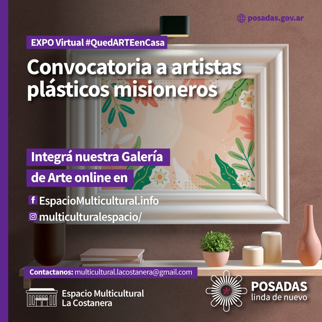 Es por eso que desde el Espacio Multicultural de la Costa, dependiente de la Secretaría de Cultura y Turismo de Posadas, convocan a artistas plásticos, mayores de 18 años, de toda la Provincia de Misiones, a exponer en forma virtual una serie de trabajos que formarán la Galería de Arte de las páginas de Facebook e Instagram. Expo Virtual #QuedARTEenCasa entusiasmó a gran cantidad de artistas, y también se abre una ventanita con posibilidad de venta.
