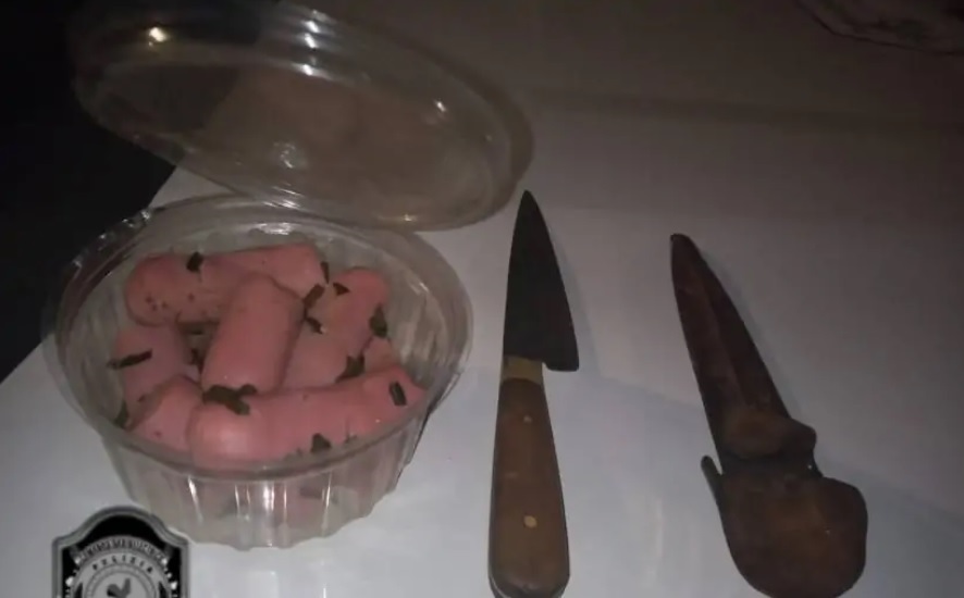 En poder de los mismos incautaron un cuchillo de 25cm aproximadamente de fabricación artesanal y un recipiente con trozos de salchichas con vidrios incrustados.