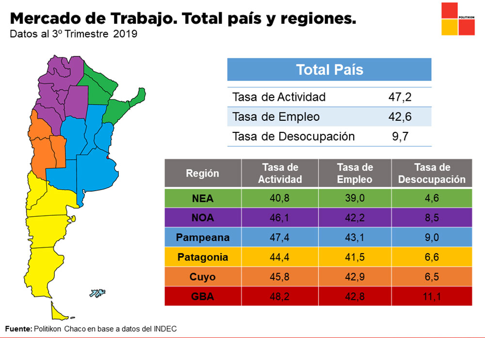 A nivel nacional, en el tercer trimestre de 2019, mostró una tasa de actividad de 47,2%, de empleo de 42,6″ y un 9,7% de desocupación, descendiendo levemente respecto al trimestre anterior, informa Politkon Chaco.
