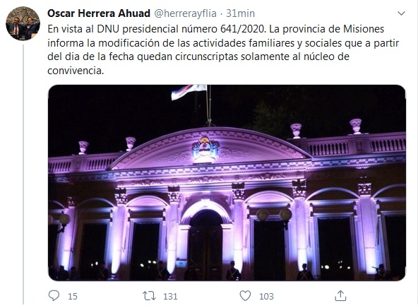 “En vista al DNU presidencial número 641/2020. La provincia de Misiones informa la modificación de las actividades familiares y sociales que a partir del día de la fecha quedan circunscriptas solamente al núcleo de convivencia”, comunicó el titular del Poder Ejecutivo provincia.