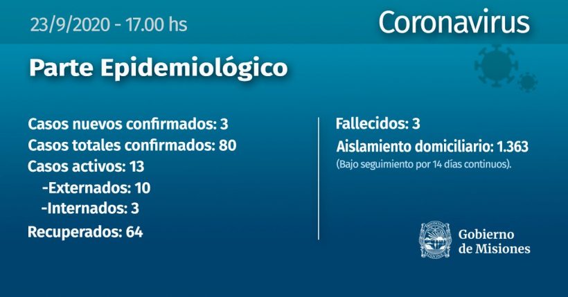 Se trata de un joven de 28 años, de Puerto Esperanza; una mujer de 76 años y un adolescente de 17 años, ambos de Posadas. Lo confirmó el Ministerio de Salud Pública de la Provincia en su parte epidemiológico que difundió en la tarde de este miércoles.