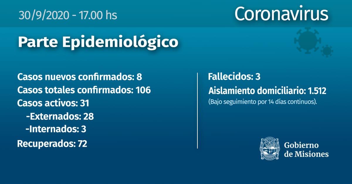 El Ministerio de Salud Pública de Misiones confirmó este miércoles que se registraron ocho nuevos casos positivos de coronavirus en la provincia. De acuerdo a lo informado, se trata de cuatro pacientes de Posadas y cuatro de Puerto Iguazú.