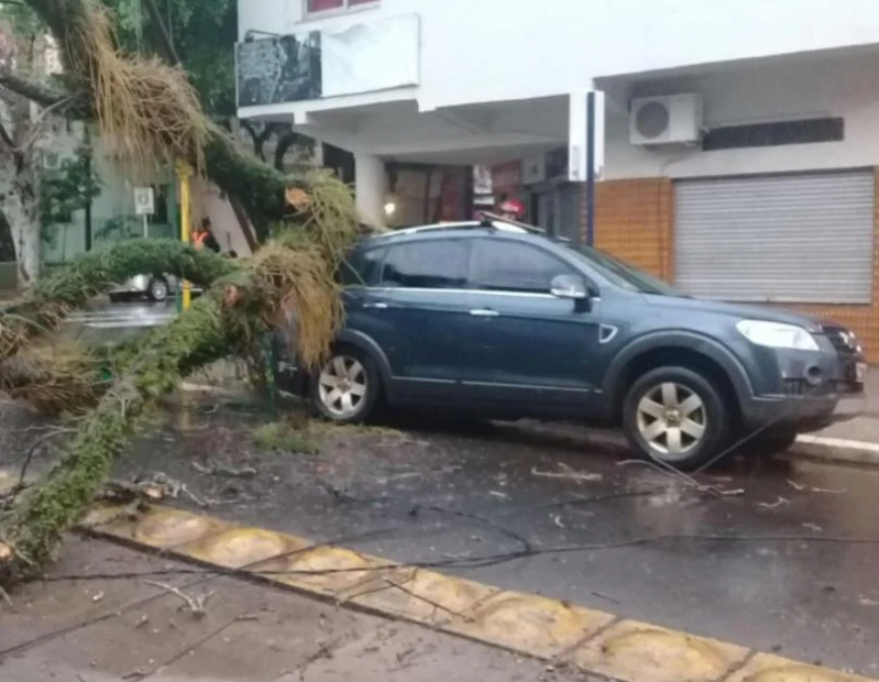 Las fuertes lluvias sumado a las ráfagas de vientos provocaron la caída de un árbol sobre un auto en pleno microcentro de Posadas. Solamente hubo daños materiales.