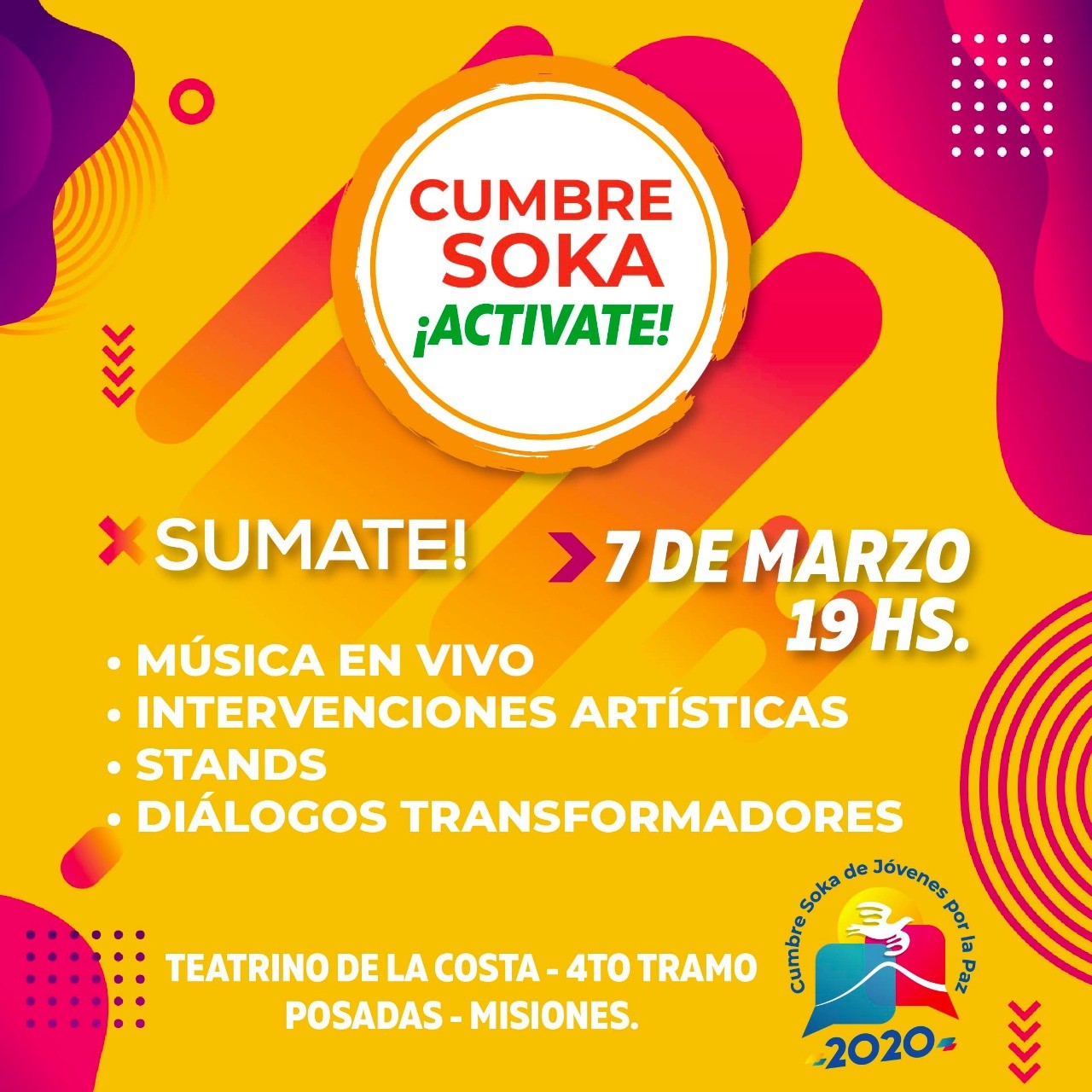 La Cumbre Soka denominada ¨Activate¨ es un festival por la paz llevado a cabo por la organización budista laica Soka Gakkai Internacional de la Argentina. Será este sábado 7 de marzo a partir de las 19hs en el Teatrino de la Costanera de Posadas – 4º tramo-. Actividad libre y gratuita.