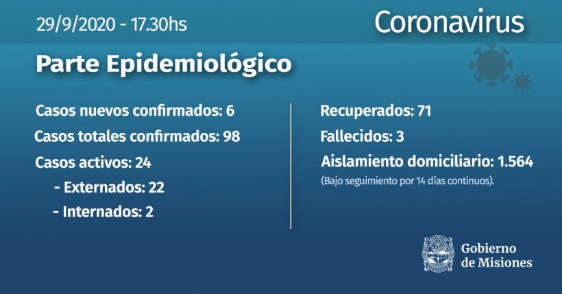 2/6 – Paciente sexo masculino, 64 años de edad con comorbilidades. Nexo epidemiológico en estudio. Internado: estable. Cumpliendo esquema terapéutico bajo medidas de bioseguridad. Posadas.