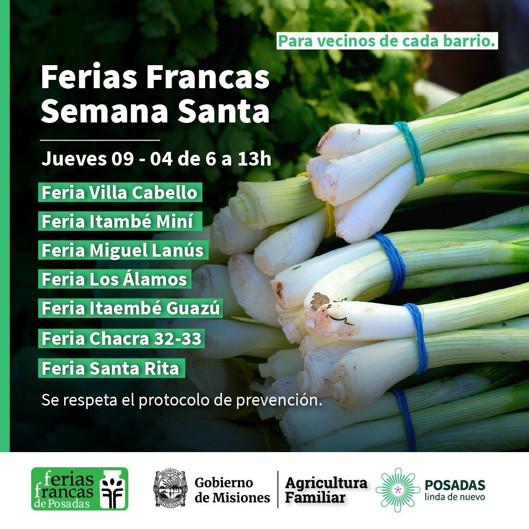A las ferias de Villa Cabello, Santa Rita, Miguel Lanús, Itaembé Miní y Chacra 32-33, se le sumarán las que se encuentran en Itaembé Guazú y en barrio Los Álamos. Todas funcionarán de 06:00 a 13:00, respetando las recomendaciones sanitarias y protocolo de seguridad.