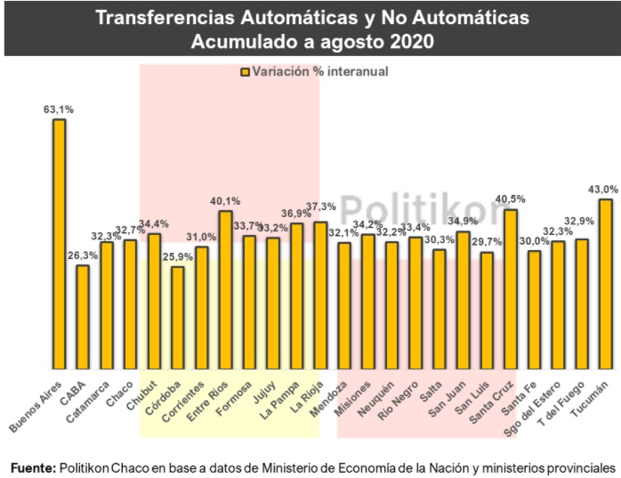 Acumulado a agosto 2020, las transferencias totales (automáticas y no automáticas) del Estado nacional a las provincias y la CABA totalizaron $1.567.110 millones, creciendo un 39,2% contra el mismo período 2019, por lo cual pierden ante la inflación, a partir de la caída de los recursos automáticos (coparticipación) y pese al fuerte incremento de las transferencias discrecionales en el marco del programa de emergencia sanitaria por la pandemia del COVID19.